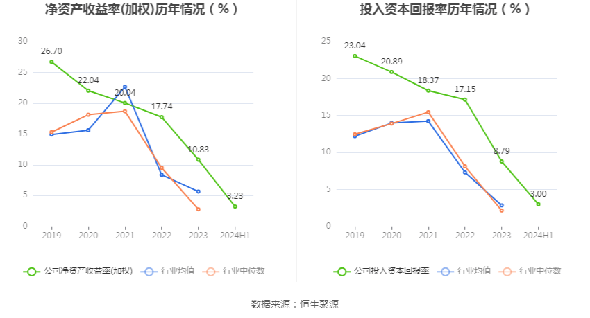 数据显示,2024年上半年公司加权均匀净资产收益率为3.23%,较上年同期降落3.84个百分点;公司2024年上半年加入资金回报率为3.00%,较上年同期降落4.03个百分点。