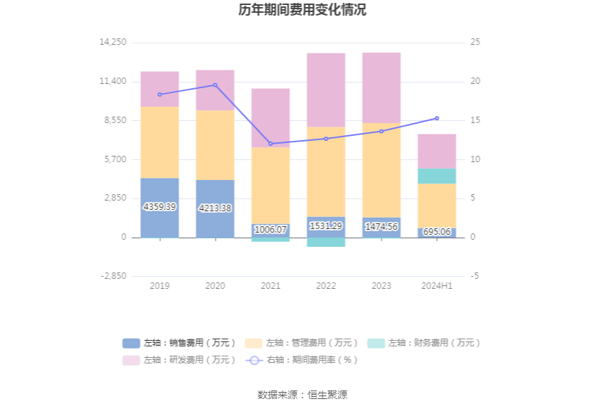 2024年上半年,公司时候用度为7565.67万元,较上年同期添加1303.03万元;时候用度率为15.30%,较上年同期上升2.57个百分点。个中,出售用度同比增进5.67%,处分用度同比降落0.73%,研发用度同比降落3.53%,财政用度由昨年同期的-259.96万元变为1121.49万元。