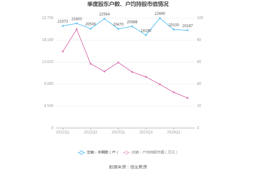 筹码齐集度方面,截至2024年上半年尾,公司股东总户数为2.02万户,较一季度末降落了143户,降幅0.70%;户均持股市值由一季度末的32.46万元降落至27.32万元,降幅为15.83%。