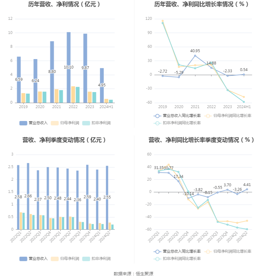 2024年上半年,公司毛利率为26.03%,同比降落11.23个百分点;净利率为10.88%,较上年同期降落10.04个百分点。从单季度目标来看,2024年第二季度公司毛利率为25.41%,同比降落10.69个百分点,环比降落1.27个百分点;净利率为11.08%,较上年同期降落10.36个百分点,较上一季度上升0.40个百分点太阳集团官网登录入口。
